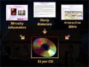 The Outreach CD Project, originated several years ago. It's intent is to encourage ministries and churches throughout the nation, to distribute an interactive study bible 'BibleView' with study materials and ministry specific information (screen 2), on a CD-ROM at the low cost of $2 each.
